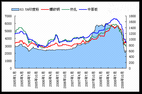 現(xiàn)貨鐵礦石-鋼材價格走勢: