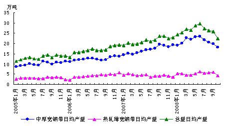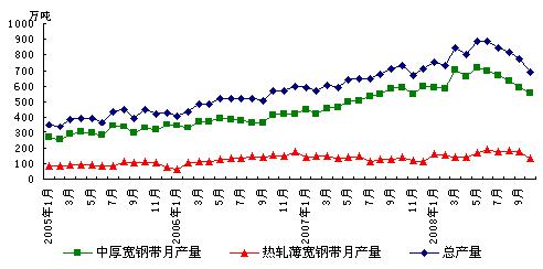 2008年1-10月份我國共生產(chǎn)熱軋薄寬鋼帶(即厚度小于3mm、寬度大于等于600mm熱軋卷材)1775萬噸,同比增加226.65萬噸,同比增長14.6%。其中10月份共生產(chǎn)熱軋薄寬鋼帶134.69萬噸,較9月份減少42.79萬噸,環(huán)比降幅達(dá)到驚人的31.79%;同比減少36.38萬噸,同比降低21.3%。從圖1中可知,熱軋薄寬鋼帶產(chǎn)量在今年6月份達(dá)到189.03萬噸的單月歷史最高產(chǎn)量后,一直保持著170萬噸以上的單月產(chǎn)量水平,而10月份產(chǎn)量已快速回落至今年3、4月份的低水平。