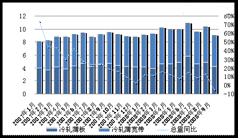 國(guó)內(nèi)外經(jīng)濟(jì)形勢(shì)的變化導(dǎo)致用鋼行業(yè)需求銳減,進(jìn)出口貿(mào)易量下降,市場(chǎng)價(jià)格持續(xù)大幅回落,部分冷軋鋼廠在10月繼續(xù)限產(chǎn)。受此影響,10月冷軋板卷資源供應(yīng)量同比下降17.6%,連續(xù)兩個(gè)月出現(xiàn)負(fù)增長(zhǎng),并創(chuàng)下26個(gè)月來(lái)的新低,僅為250萬(wàn)噸。1-10月冷軋板卷累計(jì)資源供應(yīng)量則為2997萬(wàn)噸,較去年同期的2911萬(wàn)噸增加3個(gè)百分點(diǎn)。