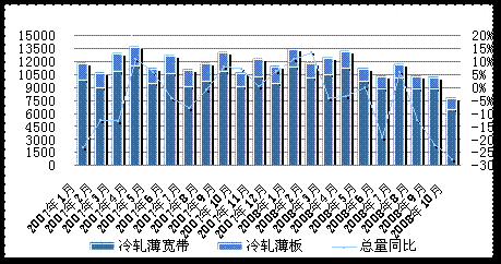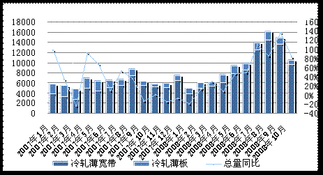 由于經(jīng)濟(jì)下滑,國(guó)內(nèi)工業(yè)生產(chǎn)受到?jīng)_擊,10月規(guī)模以上工業(yè)增加值增速降至8.2%便是有力證明,需求自然受到影響,冷軋板卷進(jìn)口量隨之下降。10月冷軋板卷進(jìn)口量為24.05萬(wàn)噸,同比下降27.3%,環(huán)比則減少21個(gè)百分點(diǎn),其中冷軋薄寬帶進(jìn)口量為20.3萬(wàn)噸,同比下降28%,環(huán)比降幅為23.4%。前10月累計(jì)進(jìn)口量為339萬(wàn)噸,同比減少6%。