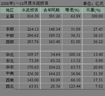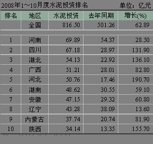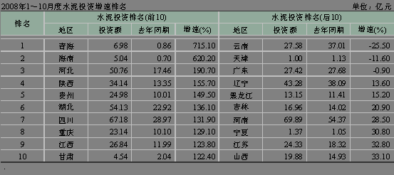 河北省受曹妃甸開(kāi)發(fā)等因素拉動(dòng),水泥投資勢(shì)頭迅猛,1~10月份累積水泥投資額達(dá)到了50.76億元,同比增長(zhǎng)190.70%,排名第三。