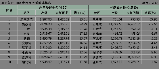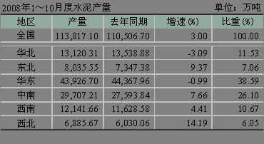 從1~10月份水泥累計(jì)產(chǎn)量看,為113,817.10萬(wàn)噸,同比增長(zhǎng)僅3.00%。華北、華東地區(qū)甚至出現(xiàn)負(fù)增長(zhǎng),華北為-3.09%,華東為-0.99%。