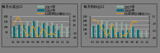 受金融危機(jī)的影響,全球經(jīng)濟(jì)增長(zhǎng)放緩,對(duì)水泥需求減緩,影響水泥產(chǎn)品的出口。10月份的水泥出口量進(jìn)一步減少,僅為68.15萬(wàn)噸,環(huán)比下降39.71%,同比下降46.94%,較9月份下降近26個(gè)百分點(diǎn);水泥熟料出口91.81萬(wàn)噸,環(huán)比下降26.93%,同比下降5.17個(gè)百分點(diǎn)。