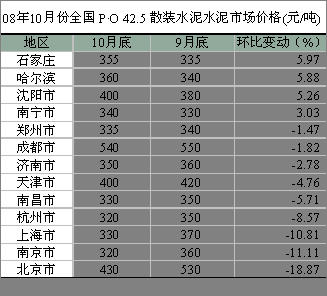 京津唐地區(qū)的北京、天津,華東江蘇、上海、浙江、江西、山東,西南四川、中南河南的價(jià)格出現(xiàn)了不同程度的下降,其中以北京價(jià)格下降幅度最大,主要是奧運(yùn)期間水泥有價(jià)無(wú)市,交易的正;,促使價(jià)格逐漸趨于正常水平。