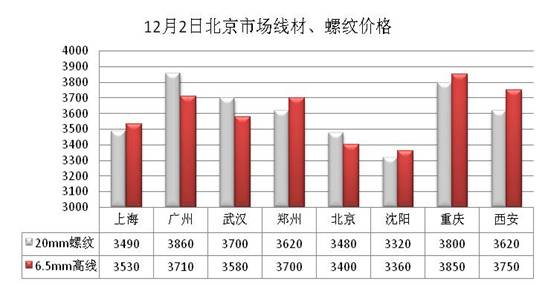 從圖列價(jià)格看,20mm螺紋價(jià)格最高的地區(qū)是華南的廣州,價(jià)格達(dá)到3860元/噸;6.5mm線材價(jià)格最高的地區(qū)是西南的重慶,價(jià)格達(dá)到3850元/噸。除東北地區(qū)外,北京市場(chǎng)線材、螺紋價(jià)格處于全國(guó)最低價(jià)位。截至12月2日,北京市場(chǎng)20mm螺紋價(jià)格為3480元/噸,高線6.5mm為3400元/噸,分別比上月同期低100元/噸。東北地區(qū)很顯然受到季節(jié)因素的影響,華南以及西南地區(qū)則是資源偏緊造成的價(jià)格居于相對(duì)高位。華北地區(qū)鋼廠受到流通商市場(chǎng)操作的影響較大。