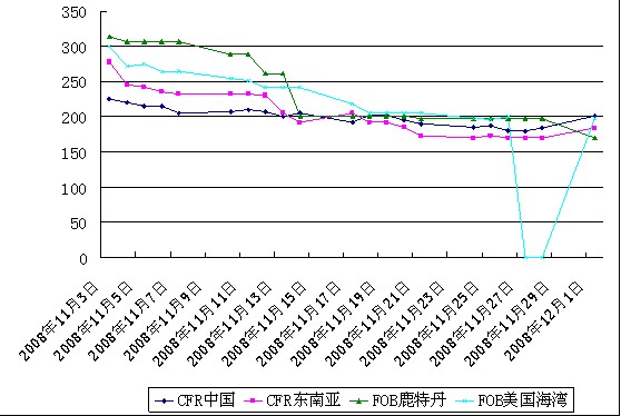 東南亞市場(chǎng):中國(guó)價(jià)格對(duì)該地市場(chǎng)價(jià)格影響深遠(yuǎn),該地區(qū)下游開(kāi)工率持續(xù)低迷的形勢(shì)仍未好轉(zhuǎn)、侵襲全球的金融風(fēng)潮在該地大有愈演愈烈之勢(shì),交投雙方商談不暢,市場(chǎng)鮮有確認(rèn)的交易。周四閉市時(shí),該地收盤(pán)價(jià)收于200-210美元/噸CFR東南亞,較前期大幅下跌30美元/噸。