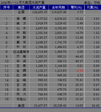 2008年1~11月全國水泥大集團水泥產(chǎn)量統(tǒng)計