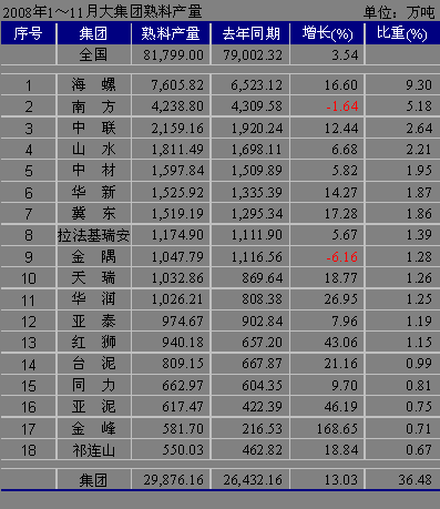 2008年1~11月全國水泥大集團熟料產(chǎn)量統(tǒng)計