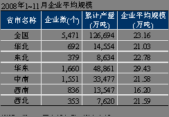 總產(chǎn)量增速趨緩,而企業(yè)數(shù)目的增多,使水泥企業(yè)平均規(guī)模略有下降。1~11月,全國企業(yè)平均規(guī)模為23.16萬噸,較2007年同期下降了0.54個百分點。除華東地區(qū)水泥企業(yè)平均高于全國平均水平外(1~11月為29.43萬噸),其他五大區(qū)域的企業(yè)規(guī)模均小于全國平均水平,以西南地區(qū)最為明顯,僅為16.20萬噸。