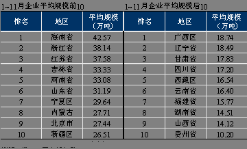 但區(qū)域內(nèi)具有極大分化:華東的浙江、江蘇和山東三省入圍前10,而福建省的平均規(guī)模卻為全國倒數(shù)第四位;中南的海南平均規(guī)模居全國首位,河南為第4位,而廣西、湖南、山西的平均規(guī)模在全國排名后10之列;華北、西北企業(yè)平均規(guī)模較大,內(nèi)蒙古、北京,寧夏、新疆入圍前10;西南地區(qū)企業(yè)平均規(guī)模普遍較小,除重慶外,四川、西藏、云南、貴州四省均進入全國平均規(guī)模后10。