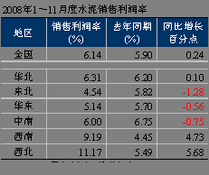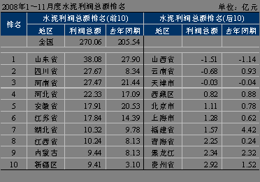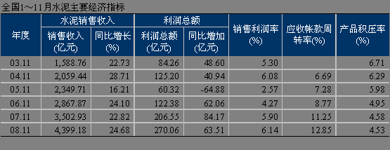 國際金融危機的波及考驗著各個產(chǎn)業(yè),鋼鐵、有色金屬、化工等紛紛落馬,價格普現(xiàn)深跌,甚至面臨整體虧損的困境。透析1~11月份水泥運行數(shù)據(jù),水泥產(chǎn)業(yè)利潤在成本上升、市場下行的背景下,卻走出一輪逆勢而上的行情,取得了驕人的業(yè)績。