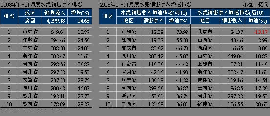1~11月,水泥產(chǎn)業(yè)實現(xiàn)銷售收入4,399.18億元,同比增長24.68%,較2007年提高2個百分點。除北京由于奧運影響,是各省市中唯一的銷售收入負增長區(qū),其他的省份的銷售收入均出現(xiàn)不同幅度的提高。