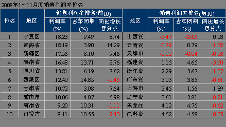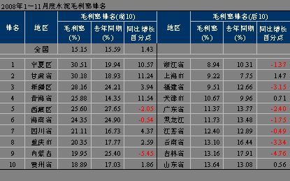1~11月全國水泥銷售毛利率為15.15%,和2007年基本持平?梢哉f,今年煤炭、燃油成本的大幅上漲被消化,轉(zhuǎn)移到下游產(chǎn)業(yè);經(jīng)濟形勢下挫仍然沒有阻止水泥產(chǎn)業(yè)盈利能力提高的腳步。毛利率排名前10中,除海南、內(nèi)蒙古外,都分布在西北和西南;排名后10個地區(qū)中,華東地區(qū)占了5個。