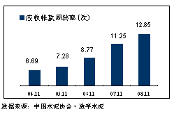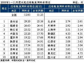 隨著銷售收入的快速增長,1~11月應收賬款有所上升,為366.51億元,同比上升了12.09%,上升幅度在合理范圍。應收賬款周轉(zhuǎn)率卻較2007年同期加快1.6次,達到12.85次[1]。在應收賬款周轉(zhuǎn)率排名前10的地區(qū)中,貴州的應收賬款最低為5.41億元,周轉(zhuǎn)率29.20次,居全國首位,較2007年同期提高13.82次;浙江和江蘇的應收賬款周轉(zhuǎn)率較高,分別為23.52次和17.34次,說明沿海的水泥大省對資金回收非常重視。