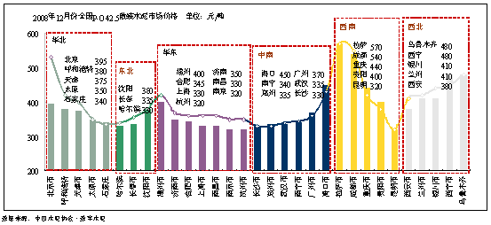 截止2008年12月,根據(jù)數(shù)字水泥網(wǎng)對全國31個城市水泥價格的跟蹤情況顯示,全國水泥市場平均價格P.O42.5散裝383元/噸,與2007年同期325元/噸相比,增長17.64%。增長幅度最大的是西寧、銀川、重慶、蘭州和濟南,均在40%以上。