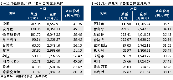 我國水泥出口地區(qū)主要是美國、非洲、俄羅斯和周邊國家地區(qū),美國仍然是我國最大的水泥出口國,但比2007年同期相比減少了近300萬噸;俄羅斯今年從我國水泥進口量急劇增加。熟料出口方面,1~11月份,我國向阿聯(lián)酋出口的熟料達到287.04萬噸,已超過西班牙,躍居第一位;西班牙在國內(nèi)新建生產(chǎn)線的投產(chǎn),使今年向其熟料出口急劇下降,與2007年同期相比,減少了近500萬噸。