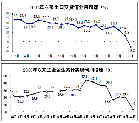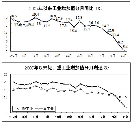 工業(yè)生產(chǎn)增速大幅下滑。11月份,規(guī)模以上工業(yè)增加值同比增長5.4%,為1998年公布該指標以來月度增速最低值(剔除春節(jié)因素),增速比上月減緩2.8個百分點,同比減緩11.9個百分點。1-11月,規(guī)模以上工業(yè)增加值累計增長13.7%,同比減緩4.8個百分點。