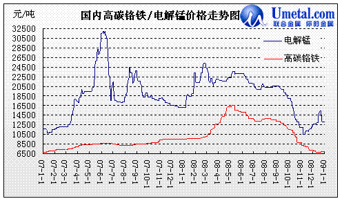 高碳鉻鐵方面:2008年國內(nèi)鉻鐵市場跌宕起伏,有很多客觀因素、圍觀因素,比如奧運會、環(huán)保、限電等,但最基本的因素仍是由供需方面所構(gòu)成。08年前五個月高鉻市場受鉻礦價格、運費、關(guān)稅等方面的影響繼續(xù)延續(xù)07年的漲勢;但是自6月份開始,在鐵礦價格下跌的帶動下,鉻礦價格也開始下滑,隨后不銹鋼廠需求的下降直接導(dǎo)致高鉻價格大幅下跌,70-80%的高鉻生產(chǎn)企業(yè)被迫停產(chǎn)或轉(zhuǎn)產(chǎn)。08年最后一月特別是春節(jié)前的一個月,往往都是商家采購的相對頻繁的時期,出于對春節(jié)后市場不確定的考慮,備有適量生產(chǎn)庫存的現(xiàn)象顯得較為常見。截至08年底高鉻市場價格穩(wěn)定在6500-7000元/噸。