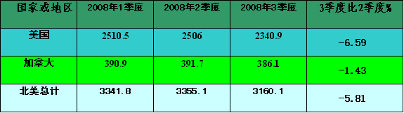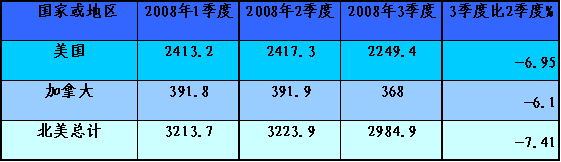 北美市場(chǎng)熱軋鋼材產(chǎn)量2008年一、二季度上升,到3季度后明顯下降。其中美國(guó)熱軋鋼材產(chǎn)量三季度比二季度下降6.95%,北美市場(chǎng)整體下降了7.41個(gè)百分點(diǎn)。