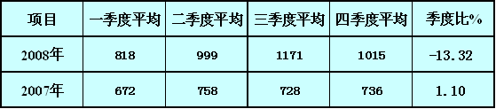 (2)扁平材市場(chǎng):從下表看出,美國(guó)扁平材市場(chǎng)市場(chǎng)價(jià)格走勢(shì)與長(zhǎng)材走勢(shì)相近。2007年底至2008年初,由于冬季需求淡季,美國(guó)熱軋板卷市場(chǎng)成交價(jià)下跌,但冷軋板卷成交價(jià)呈穩(wěn)定態(tài)勢(shì)。四季度扁平材均價(jià)環(huán)比三季度小幅上升1.39%。