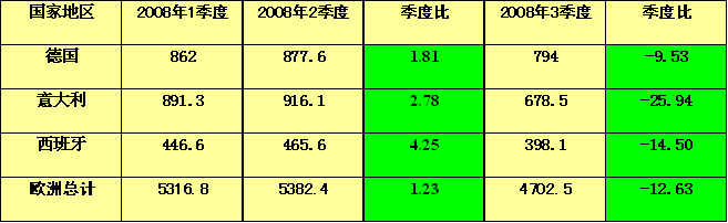 2008年歐洲經(jīng)濟逐漸陷入衰退。歐元區(qū)經(jīng)濟體二、三季度GDP同比雖有增長,但環(huán)比卻連續(xù)兩個季度下降,分別下降0.7和0.8個百分點,預計四季度GDP同比負增長。11月14日,歐元區(qū)正式宣告于1999年成立以來經(jīng)濟首次陷入衰退。在歐元區(qū)經(jīng)濟體中,德國第三季度GDP較二季度萎縮0.5%,連續(xù)三個季度下滑,自2003年以來首次陷入衰退;英國公布第三季度GDP較前一季度下降0.6%,英國在第二季度經(jīng)濟已經(jīng)陷入停滯;法國央行先期預計四季度GDP季降0.5%;意大利第三季度GDP季降0.5%,年降0.9%,為1998年以來最大降幅,意大利經(jīng)濟陷入2005年初以來首次衰退。