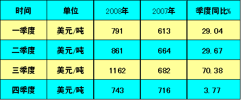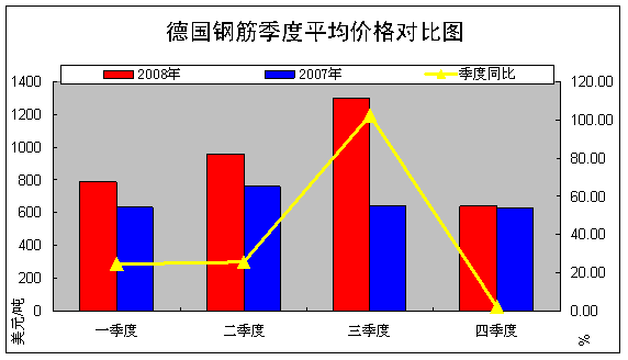 (1)鋼筋。2008年德國鋼筋市場交易一季度平均價格790美元/噸,同比上漲24.41%,到三季度同比漲幅一躍達到102.2個百分點,四季度又跌到2.06%,季度跌幅震蕩了100%。