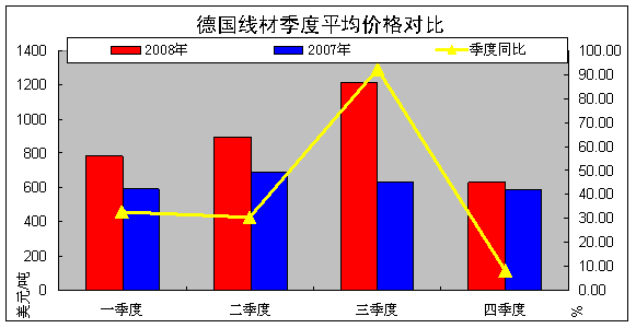 (2)線材。2008年德國線材市場交易一季度平均價格782美元/噸,同比上漲32.77%,漲幅高于鋼筋,二季度基本穩(wěn)定,三季度同比漲幅達到90.42%,四季度跌到8.02個百分點。