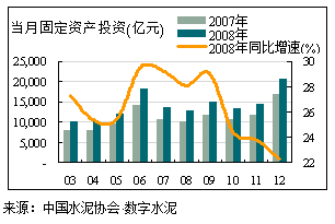 城鎮(zhèn)固定資產(chǎn)投資單月投資額增速繼續(xù)下滑,但總量上首次突破20,000億元;房地產(chǎn)投資連續(xù)6個月增速下降,但降幅平穩(wěn);水泥投資繼續(xù)連續(xù)7個月高位平穩(wěn)運行;12月產(chǎn)量未能實現(xiàn)爆發(fā)式增長,全年產(chǎn)量13.88億元,同比增長5.2%。增加投資擴大內需的系列措施對水泥行業(yè)積極影響會有多大還需進一步觀察。