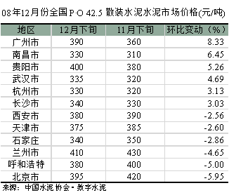 主要受年底工程收尾、需求量增加的刺激,廣東、江西、貴州、湖北、浙江、湖南六省的水泥價格實現(xiàn)了10~30元的上漲,其中以廣東價格上漲幅度較大,為8.33%;而陜西、天津、河北、甘肅、內蒙、北京的價格卻不同程度的下降,其他以北京為最,下降了35元/噸,主要是由于今年受經(jīng)濟形勢影響新房地區(qū)開工項目少的可憐,以及奧運會結束后北京地區(qū)重點工程減少的影響。