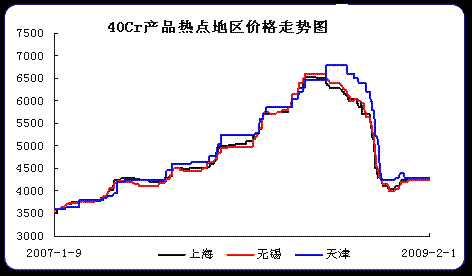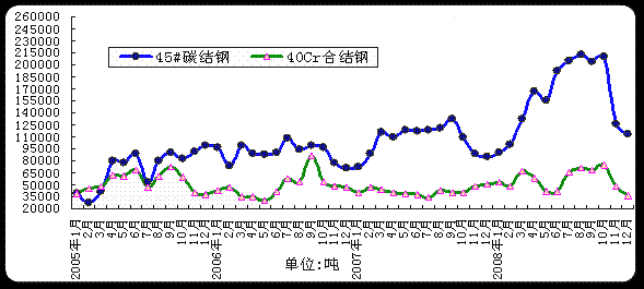 2、國內(nèi)主要優(yōu)鋼企業(yè)庫存情況分析 2008年12月份國內(nèi)15家主要優(yōu)鋼企業(yè)45#碳結(jié)鋼合計庫存量為11.272萬噸,較2008年11月份減少1.2723萬噸;2008年12月份40Cr合計庫存量為3.6774萬噸,較2008年11月份減少1.115萬噸。如圖6: