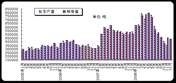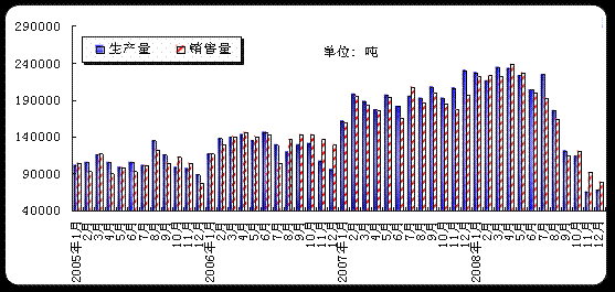 一、市場面分析 1、國內(nèi)主要優(yōu)鋼企業(yè)產(chǎn)、銷情況分析 (1)優(yōu)碳鋼:2008年12月份國內(nèi)21家主要優(yōu)鋼企業(yè)合計產(chǎn)量為43.2002萬噸,較2008年11月增加7.786萬噸;12月份合計銷量為44.2029萬噸,較2008年11月份減少1.4976萬噸。2008年12月份產(chǎn)銷率超過100%;如圖4: