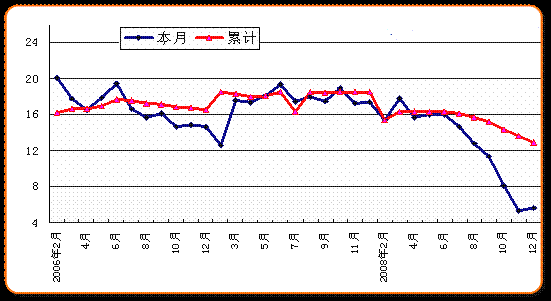 從圖6中,我們可以看出國內(nèi)主導(dǎo)鋼廠碳結(jié)鋼、合結(jié)鋼產(chǎn)品的庫存量的變化走勢,在2008年8-10月份創(chuàng)造歷史庫存新高后,在鋼廠減產(chǎn)、限產(chǎn)措施的調(diào)整下,鋼廠庫存量明顯回落,12月底已經(jīng)恢復(fù)到2008年1季度水平。鋼廠庫存的縮減主要是受到雙方面的影響,一是鋼廠的產(chǎn)量,二是產(chǎn)品的實際出庫量。 隨市場銷售價格逐步反、鋼廠原材料成本的整體下降,優(yōu)鋼鋼廠生產(chǎn)經(jīng)營狀況將明顯好轉(zhuǎn)。12月份優(yōu)鋼鋼廠結(jié)構(gòu)鋼產(chǎn)量有逐步增加跡象。另統(tǒng)計2月份優(yōu)鋼鋼廠優(yōu)鋼類產(chǎn)品計劃產(chǎn)量也較1月份有所增加,具體如下: 二、市場基本面分析 (1) 去年12月我國工業(yè)增加值增速反彈至5.6% 近日,中共中央政策研究室副主任鄭新立判斷,盡管2008年12月工業(yè)增加值增速初見反彈,但中國經(jīng)濟下滑之勢已成。支持這一判斷的依據(jù)有,2008年12月份工業(yè)增加值的增速降至5.6%,2008年12月份出口仍為負增長,“財政收入下降的幅度也非常大”。同時,去年12月份投資、消費數(shù)據(jù)仍保持下滑趨勢。數(shù)據(jù)顯示,去年11月份工業(yè)增加值增速為5.4%,創(chuàng)下1999年來的新低。 如果2009年中國出口的增長能夠達到10%,由政府主導(dǎo)投資的兩萬億元可以保證經(jīng)濟增長速度保持在8%以上;如果2009年出口增長速度保持在6%,兩萬億元投資可能會使經(jīng)濟增速勉強達到8%,有可能會在7%到8%之間;如果2009年出口為零增長,即使有政府主導(dǎo)的兩萬億元投資,“恐怕全年的增長速度可能會降到5%左右”;如果2009年出口為6%的負增長,甚至更低,GDP的增長速度會下跌得更多。 2009年中國出口要保持6%的增速很困難,很可能出現(xiàn)零增長甚至負增長的情況。如果一季度經(jīng)濟運行仍然沒有出現(xiàn)明顯變化,政府應(yīng)該增加投資,增強擴大內(nèi)需的力度,進一步刺激經(jīng)濟增長。 2008年中國出口增長還有17%的速度,主要得益于機電產(chǎn)品出口增速,而輕工業(yè)產(chǎn)品(主要是勞動密集型的產(chǎn)品)出口是零增長,甚至是負增長。圖7: (國家統(tǒng)計局)