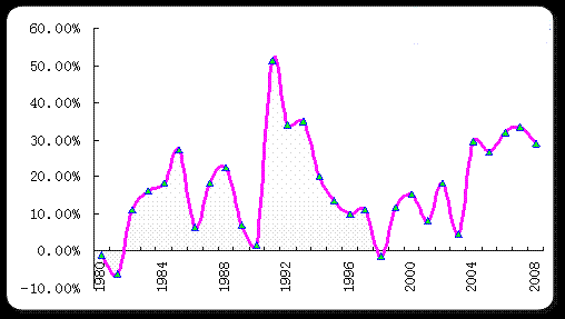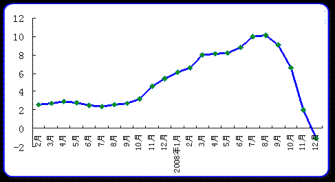 2、宏觀政策影響分析 (1)節(jié)后央行或下調(diào)超額存款準備金利率27個基點 流動性的極度充裕讓銀行的超額存款準備金率出現(xiàn)了大幅回升。盡管相關(guān)數(shù)據(jù)要等到2月份才正式公布,但據(jù)業(yè)內(nèi)人士預(yù)測,截至2008年12月末,金融機構(gòu)的平均超額存款準備金率約為3.5%,較9月末提高近1.5個百分點。該人士還預(yù)測,從倒逼銀行業(yè)放貸的這個角度出發(fā),央行可能會在春節(jié)后下調(diào)超額存款準備金利率27個基點至0.45%。 (2)12月份工業(yè)品出廠價格首次出現(xiàn)負增長 國家統(tǒng)計局22日發(fā)布的數(shù)字顯示,2008年中國工業(yè)品出廠價格比上年上漲6.9%,12月同比下降1.1%,全年漲幅比上年提高3.8個百分點。這是6年來的首次同比負增長。而造成這樣局面的主要原因在于去年12月PPI將由于原材料價格下降以及產(chǎn)能過剩的雙重原因,如圖11:(來源:國家統(tǒng)計局)