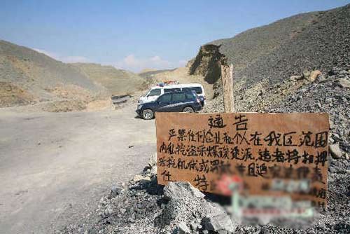 昨日,記者趕到現(xiàn)場(chǎng)時(shí),十幾輛各種型號(hào)的汽車停在露天煤礦的礦口處,其中有兩輛救護(hù)車,兩輛殯葬車,還有1輛消防車,一塊達(dá)坂城區(qū)政府2008年9月5日的通告木牌在風(fēng)中搖曳。通告內(nèi)容是:嚴(yán)禁任何企業(yè)和個(gè)人在我區(qū)范圍內(nèi)私挖濫采煤炭資源,違者將扣押采挖機(jī)械或罰款,并且追究法律責(zé)任。