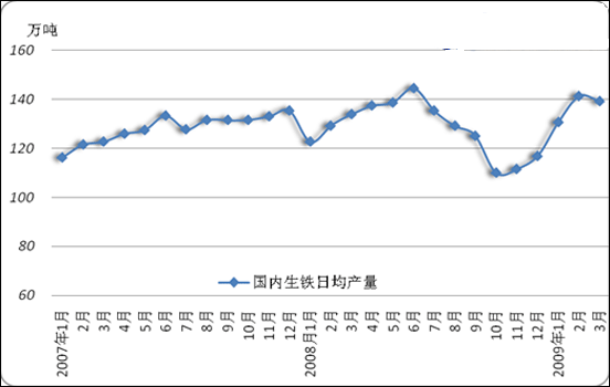 『國內(nèi)方面』2009年3月份,我國共生產(chǎn)生鐵4321.79萬噸,比去年同期增加了168.8萬噸,同比增長了6.48%;與今年2月份相比增加了365.09萬噸,環(huán)比增加了9.22%。此外,3月份我國生鐵的日均產(chǎn)量為139.41萬噸,比2月份的141.31萬噸略有下降,比去年同期相比增長了3.9%。3月份共有31天,在生鐵日產(chǎn)水平相對較平穩(wěn)的情況下,3月份的生鐵產(chǎn)量明顯增加。見圖3、圖4。