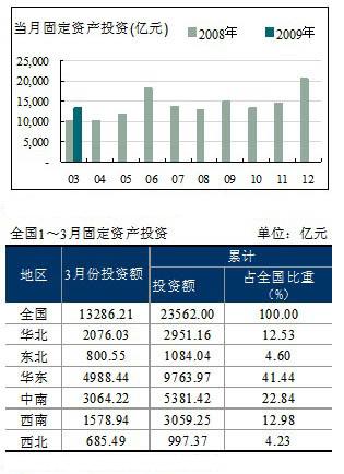 1~3月份城鎮(zhèn)固定資產(chǎn)投資累計完成額23,562億元,同比增長28.60%;其中3月份投資完成額為13286.21億元,同比增長30.31%,投資政策的拉動效應開始顯示。