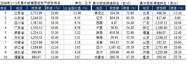 1~3月城鎮(zhèn)固定資產(chǎn)投資增速排名前10中,西南占到4個、西北3個、東北2個、華北1個。東北地區(qū),由于新增中央投資項目較好的落實、開復工項目數(shù)量和建設進度的良好保持、以及工業(yè)投資力度加大,投資保持高速增長。其中黑龍江省投資增速為72.8%、居全國之首,遼寧省次之、增速為63.5%。