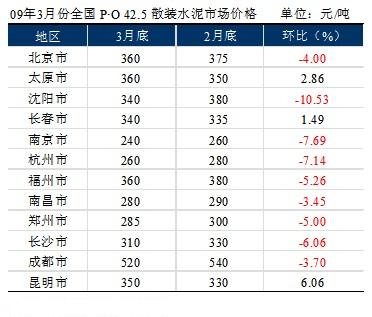 3月份全國水泥市場價格較為平穩(wěn)。就統(tǒng)計的31個省市情況來看,有9個地區(qū)價格出現(xiàn)不同幅度的下降,其中華東區(qū)4個,中南2個,東北、西南各一個;仍然呈現(xiàn)出“西高東低”的態(tài)勢。其中,沈陽下降幅度最大,為10.53%(40元/噸);價格上漲城市只有3個,分別為太原、長春和昆明,漲幅較大的昆明每噸上漲20元。