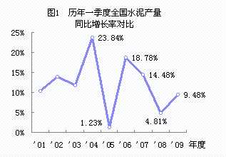 今年一季度全國水泥產(chǎn)量2. 8億噸,比去年同期增長9.5%。去年年初南方冰凍雨雪災害損失水泥產(chǎn)量1100多萬噸,今年在此基礎(chǔ)上的水泥產(chǎn)量增長率,在2000年以后仍屬較低水平(見圖1)。預計今年上半年全國水泥產(chǎn)量6.8億噸,比去年上半年增長4.6%。