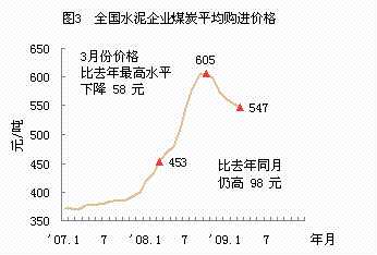 煤炭價格下降,但仍處于較高價位。三月份水泥企業(yè)煤炭購進價格平均每噸547元,比去年10月份下降58元,比去年同月高98元(見圖3)。