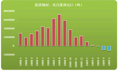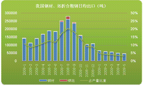 面臨全球性經(jīng)濟(jì)衰退的大背景下,我國(guó)鋼鐵外貿(mào)出口形勢(shì)受到了極其嚴(yán)重的影響。鋼材出口量自去年8月份以來(lái),幾乎持續(xù)9個(gè)月環(huán)比逐月下降,其直接出口所占國(guó)內(nèi)粗鋼產(chǎn)量的比重也由最高時(shí)的20.3%下降至今年5月份的3.1%,月均近350萬(wàn)噸的粗鋼產(chǎn)量由去年的出口轉(zhuǎn)為今年的內(nèi)銷。