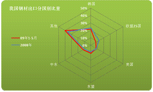相比2008年,我國(guó)鋼鐵業(yè)的主要國(guó)際貿(mào)易伙伴在2009年的格局未有明顯的變化,依然以韓國(guó)、中東、東盟、美國(guó)以及歐盟為主。歐盟市場(chǎng)份額相比去年下降了5個(gè)百分點(diǎn)。