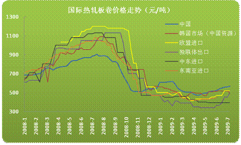 在經(jīng)濟(jì)危機(jī)下,全球鋼鐵業(yè)的生產(chǎn)情況反應(yīng)敏感。越是危機(jī)的重災(zāi)區(qū),其鋼鐵產(chǎn)量下降得越明顯。歐美國(guó)家09年粗鋼產(chǎn)量基本保持在去年的一半水平,則將近有50%的產(chǎn)能被閑置。產(chǎn)量同比降幅最小的地區(qū)是亞洲,主要受到中國(guó)產(chǎn)量增長(zhǎng)的支撐。除中國(guó)以外的亞洲其他主要鋼鐵生產(chǎn)國(guó)產(chǎn)量同比也降幅明顯,韓國(guó)前5個(gè)月產(chǎn)量同比下降17%,日本更是下降了42%。