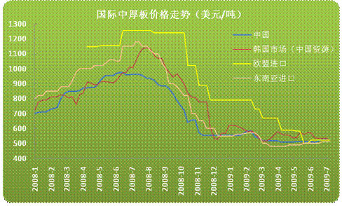 4月份以來(lái),美國(guó)的各項(xiàng)先行指標(biāo)均出現(xiàn)了不同程度的反彈,美國(guó)的PMI指數(shù)從年初的35.6提升至6月的44.8,尤其是生產(chǎn)指數(shù)已經(jīng)反彈至50以上。但是美國(guó)5月份工業(yè)行業(yè)的產(chǎn)能利用率從4月份的69%下降至68.3%,遠(yuǎn)遠(yuǎn)低于1972年以來(lái)的平均水平;制造業(yè)的產(chǎn)能利用率降至65%,也創(chuàng)下1948年該數(shù)據(jù)有記錄以來(lái)的最低值。另外與美國(guó)隔海相望的歐盟也不盡如人意,6月份歐盟27國(guó)制造業(yè)產(chǎn)能利用率僅為71%,為近20年來(lái)的新低。而高失業(yè)率也同樣成為歐盟經(jīng)濟(jì)復(fù)蘇的絆腳石。另外作為我國(guó)鋼鐵重要的貿(mào)易伙伴國(guó),韓國(guó)的經(jīng)濟(jì)形勢(shì)也不容樂(lè)觀,一季度GDP同比下降了1.6%,且5月份的工業(yè)生產(chǎn)指數(shù)同比為-8.96%。