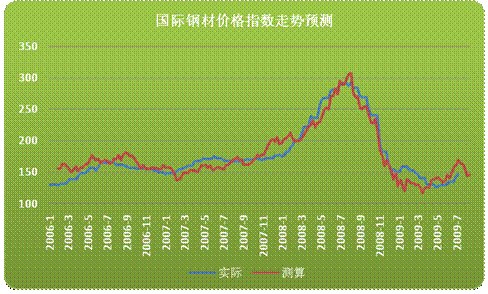 通過(guò)計(jì)算發(fā)現(xiàn),將原油價(jià)格向后移四周則可以得到與國(guó)際鋼價(jià)最高的相關(guān)性。因此我們可以初步判斷,鋼價(jià)走勢(shì)一定程度上可以參照四周前的原油價(jià)格。根據(jù)此項(xiàng)關(guān)聯(lián)測(cè)算國(guó)際鋼價(jià)走勢(shì)如下圖。從測(cè)算的鋼價(jià)走勢(shì)來(lái)看,7月末以及8月份國(guó)際鋼價(jià)面臨一股較大的上升阻力。介于國(guó)內(nèi)外鋼價(jià)的高度相關(guān)性,將這種趨勢(shì)映射在國(guó)內(nèi)鋼價(jià)后期市場(chǎng)的可能性值得關(guān)注的!