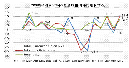 全球粗鋼產(chǎn)量的大幅減少,反映了整體需求萎縮的程度。這種萎縮在去年4季度達到了頂峰。然而從今年以來的情況看,歐洲、北美及亞洲的鋼鐵生產(chǎn)呈現(xiàn)出振蕩回升的態(tài)勢,盡管粗鋼產(chǎn)量各月同比仍然是兩位數(shù)的負增長,但是從環(huán)比的角度看,振蕩上升的趨勢較為明顯,特別是1月、3月和5月,產(chǎn)量環(huán)比增幅較為明顯。從同比降幅看,也是相同的變化趨勢,5月份粗鋼產(chǎn)量同比降幅比上月收窄了3-4個百分點。