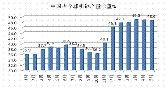 1-5月中國粗鋼產(chǎn)量占全球粗鋼產(chǎn)量的比重提高至48.4%,比上年同期提高了11.1個百分點。從分月的情況看,自上年11月以來,中國占全球粗鋼產(chǎn)量比重就在40%以上,特別是今年以來,前五個月平均比重達到48%以上,一方面說明國際市場需求萎縮程度遠遠高于國內(nèi);另一方面,從近三個月的比重變化情況看,3月份為49.0%,4月份為48.8%,5月份為48.6%,比重呈減小的趨勢,說明國際市場需求也出現(xiàn)了積極的調(diào)整因素。