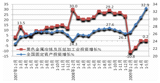 3、從投資增長情況看,今年以來鋼鐵行業(yè)的投資增長呈小幅反彈的態(tài)勢。1-5月全國城鎮(zhèn)固定資產(chǎn)投資5.35萬億元,同比增長32.9%,比上年同期增速加快7.3個百分點。但黑色金屬冶煉及壓延投資968億元,僅同比增長了0.2%,同去年同期相比,增速大幅回落了20.7個百分點。
