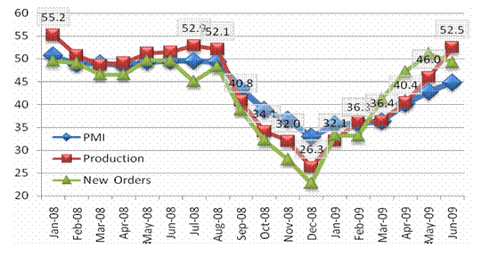 (1)美國6月份PMI指數(shù)升至44.8點,達到了自去年9月份以來最好的水平,比上年末累計上升了36.2%。盡管還是在50點以下,但是從各月的運行情況看,已經(jīng)是連續(xù)6個月環(huán)比上升,這表明美國制造業(yè)在持續(xù)好轉(zhuǎn)。6月份生產(chǎn)指數(shù)達到52.5點,是自去年8月份以來的最高點,比上年末累計上升了99.6%。新增訂單6月份略有回落,但仍是自去年7月份以來的最高點,比上年末累計上升了1.17倍。從曲線走勢看,美國制造業(yè)經(jīng)濟運行情況正在持續(xù)好轉(zhuǎn)。