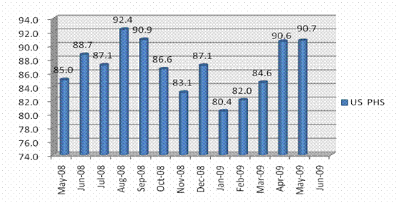 (2)一季度美國經(jīng)濟繼續(xù)萎縮,GDP下降5.5%,比去年年末美國6.3%的降幅收窄0.8個百分點,預(yù)計二季度將會有更明顯的改善。不過美國經(jīng)濟的復蘇,更多的目光還是投向房地產(chǎn)。5月份美國成屋簽約銷售指數(shù)達到90.7點,環(huán)比上升0.1,比年初累計上升了10.3點,升幅達12.8%。